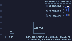 Computing Pi via perfectly elastic collisions.Heavily inspired by a video from 3Blue1Brown: https://www.youtube.com/watch?v=HEfHFsfGXjsCompute time (browser): - 3.14: 00:05:18 - 3.141: 02:44:56 - 3.1415: ??:??:??